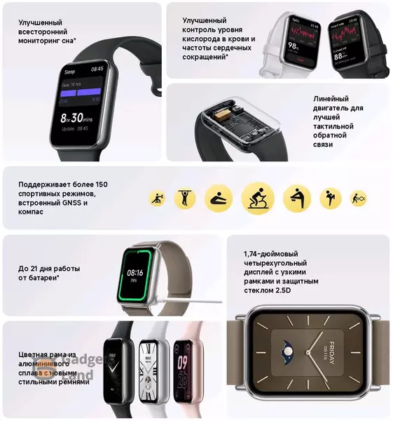 Датчики: акселерометр, гироскоп, электронный компас, оптический пульсометр и пульсоксиметр, датчик освещенности
